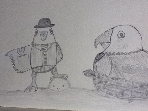 Below the bird father contemplates Joey the chick’s fate as Tony the Kea “restrains” him and awaits a negative answer eagerly!