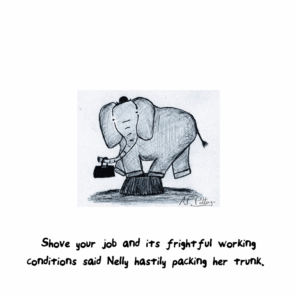 Disgruntled Elephant leaves workplace. July 8, 2014July 14, 2014 Nelly has had enough! Prints at Society6. Never miss a post: Take me to the Potting Sign Up widget. AP x Share this: Click to share on X (Opens in new window) X Click to share on Facebook (Opens in new window) Facebook Click to share on Tumblr (Opens in new window) Tumblr Click to email a link to a friend (Opens in new window) Email Click to share on Pinterest (Opens in new window) Pinterest Like Loading... Related