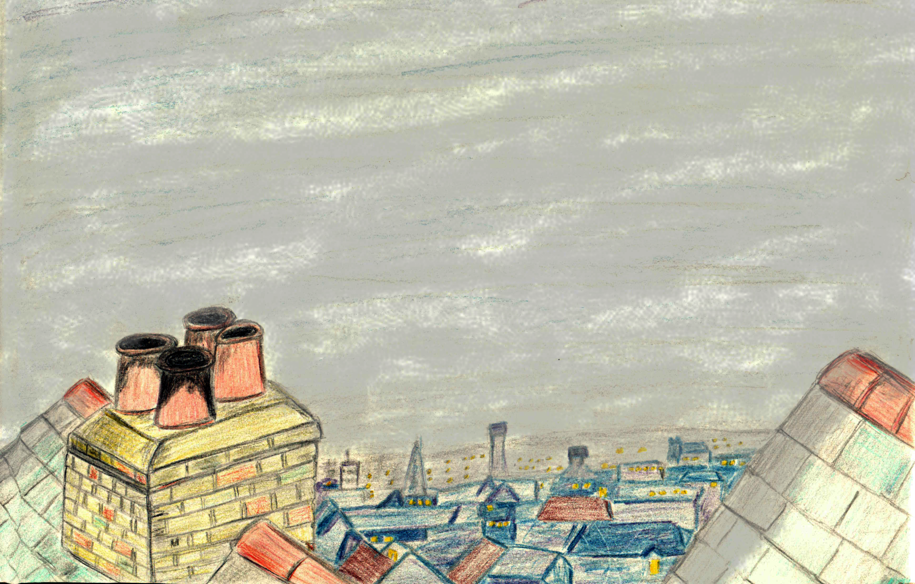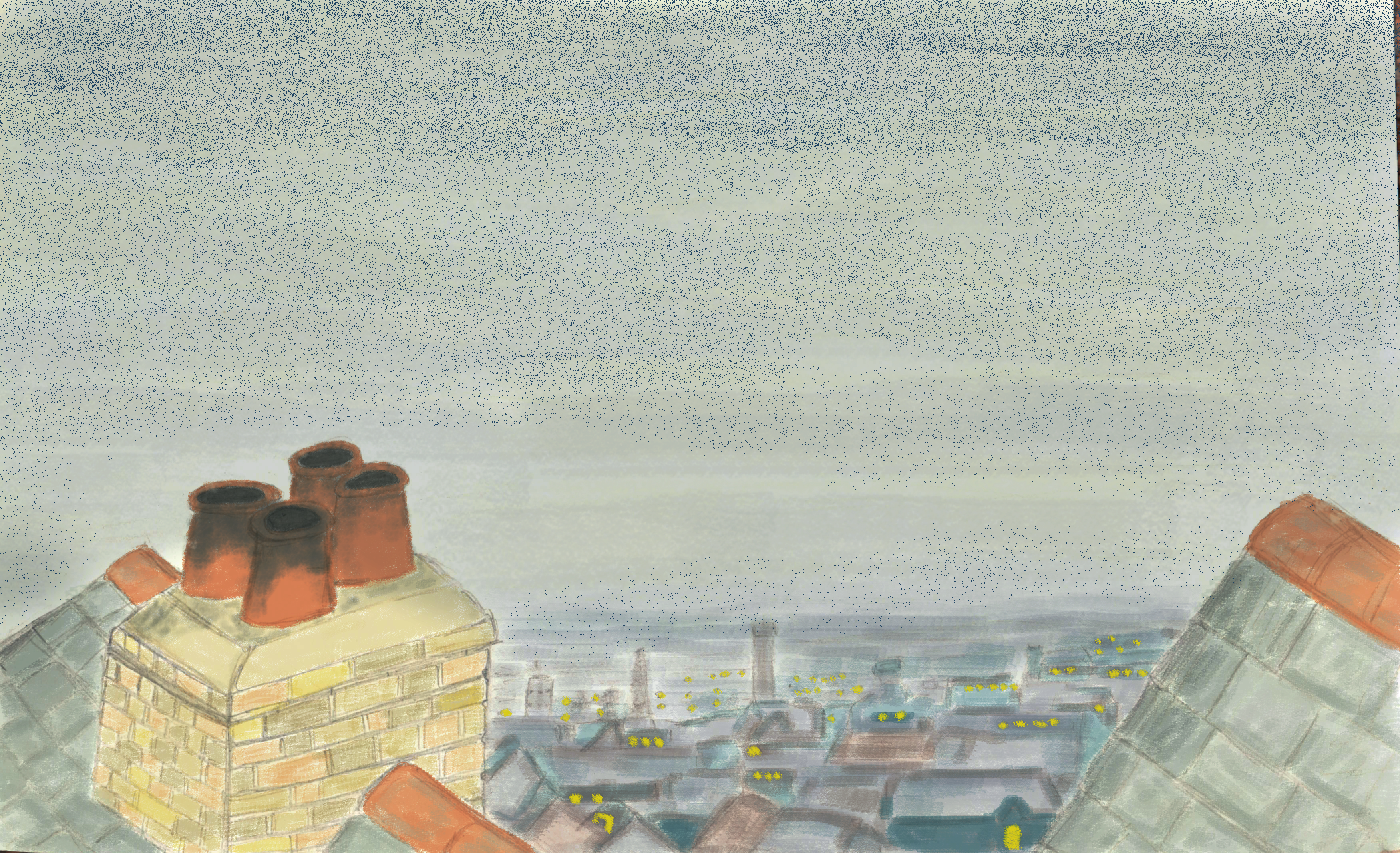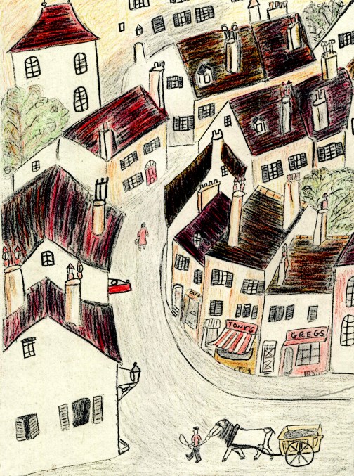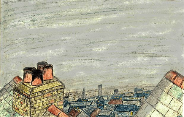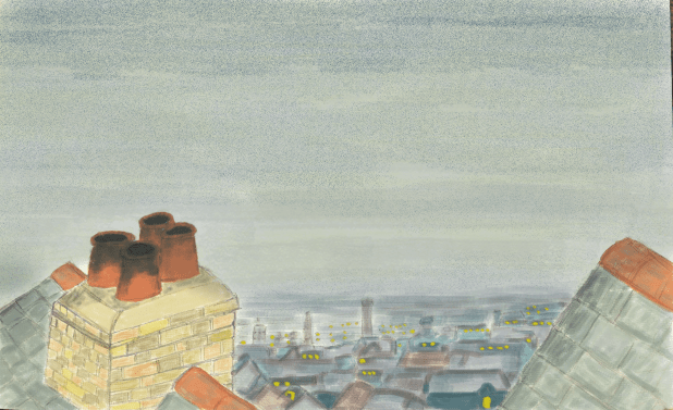 This is a roof top scene based on the wonderful Raymond Briggs story called Jim and the Beanstalk.