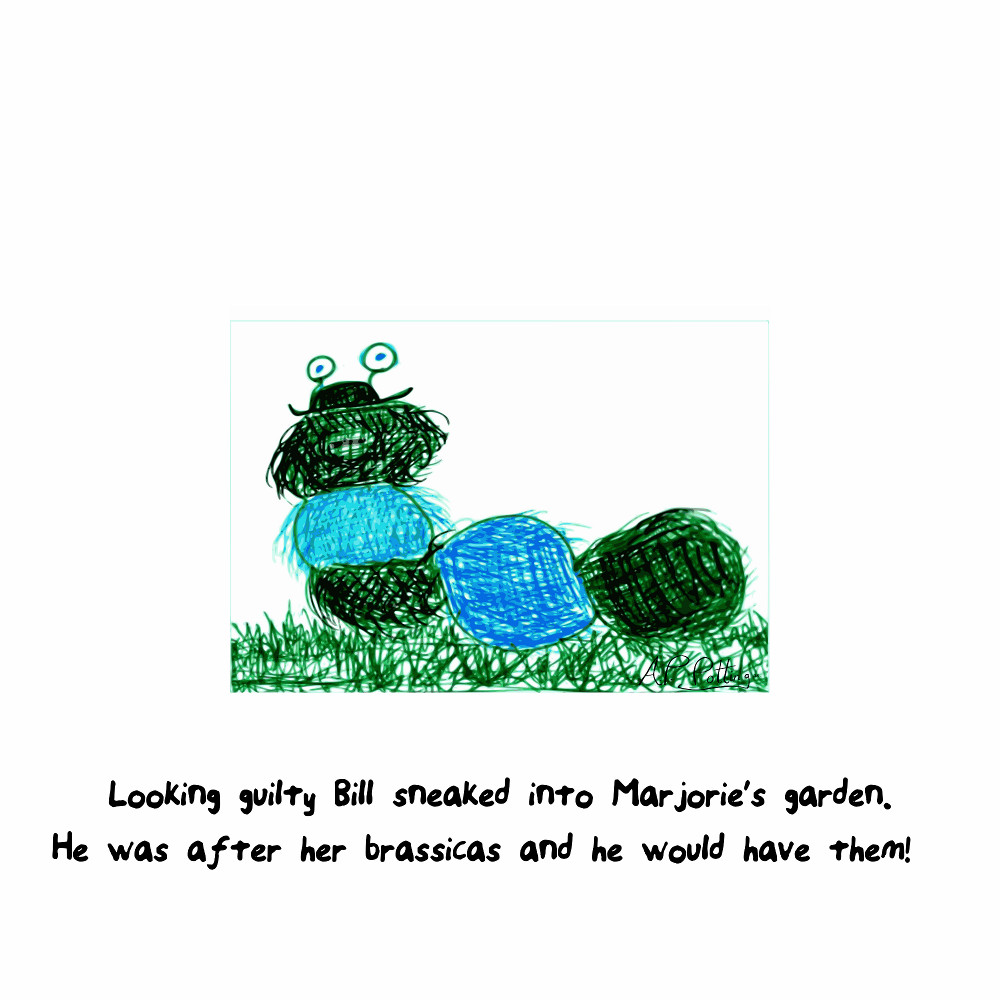 This greedy caterpillar wants to get his chops on Marjorie’s brassicas.
